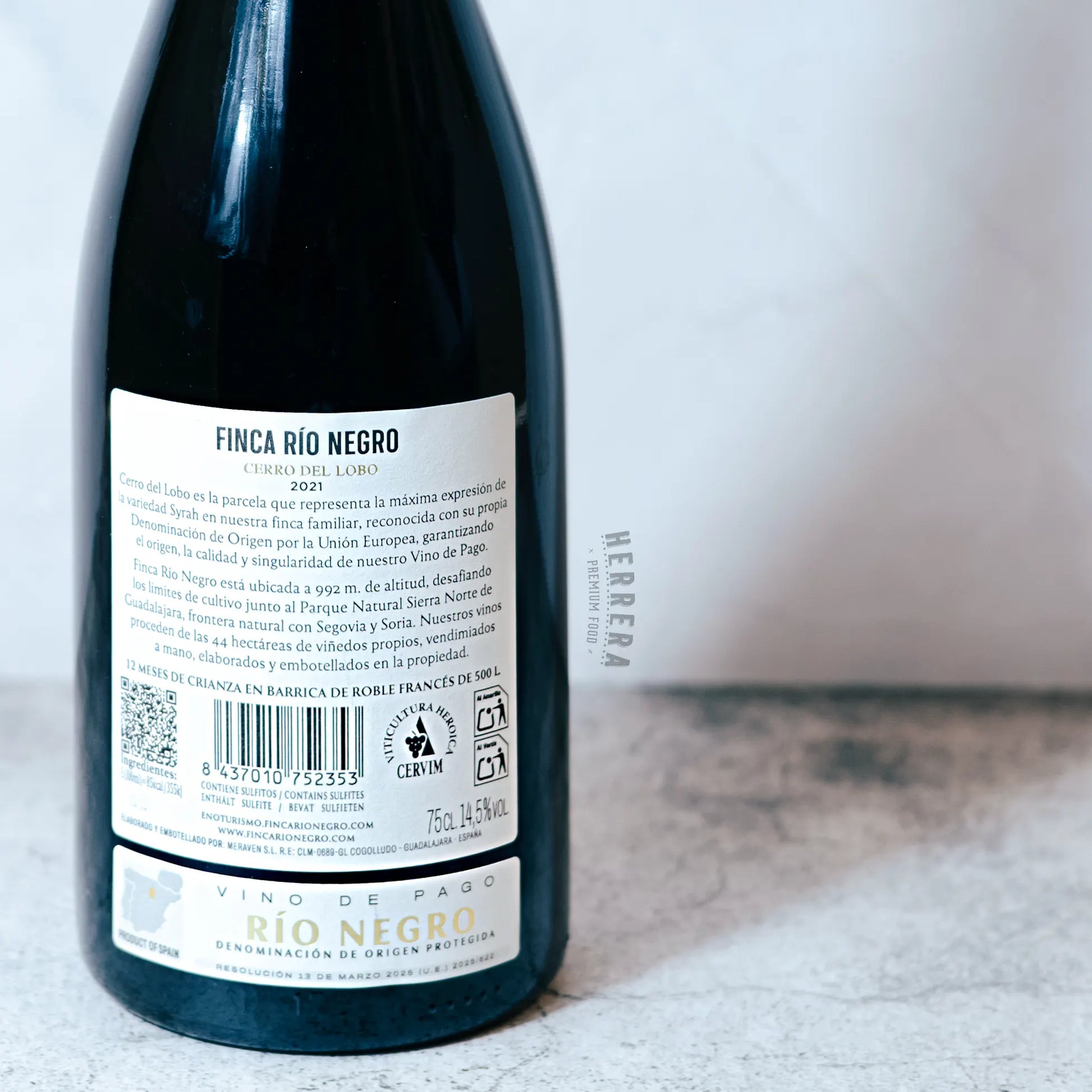 En HerreraFood, te invitamos a sumergirte en una experiencia vinícola inigualable con Cerro del Lobo 2021, un vino tinto monovarietal de Syrah que te transportará a un mundo de exquisitez y sofisticación. Este vino ha sido elaborado con esmero en la parcela más septentrional de Finca Río Negro, situada en una ladera de pronunciada pendiente delimitada por dos arroyos, representando la máxima expresión de la variedad Syrah en la bodega.