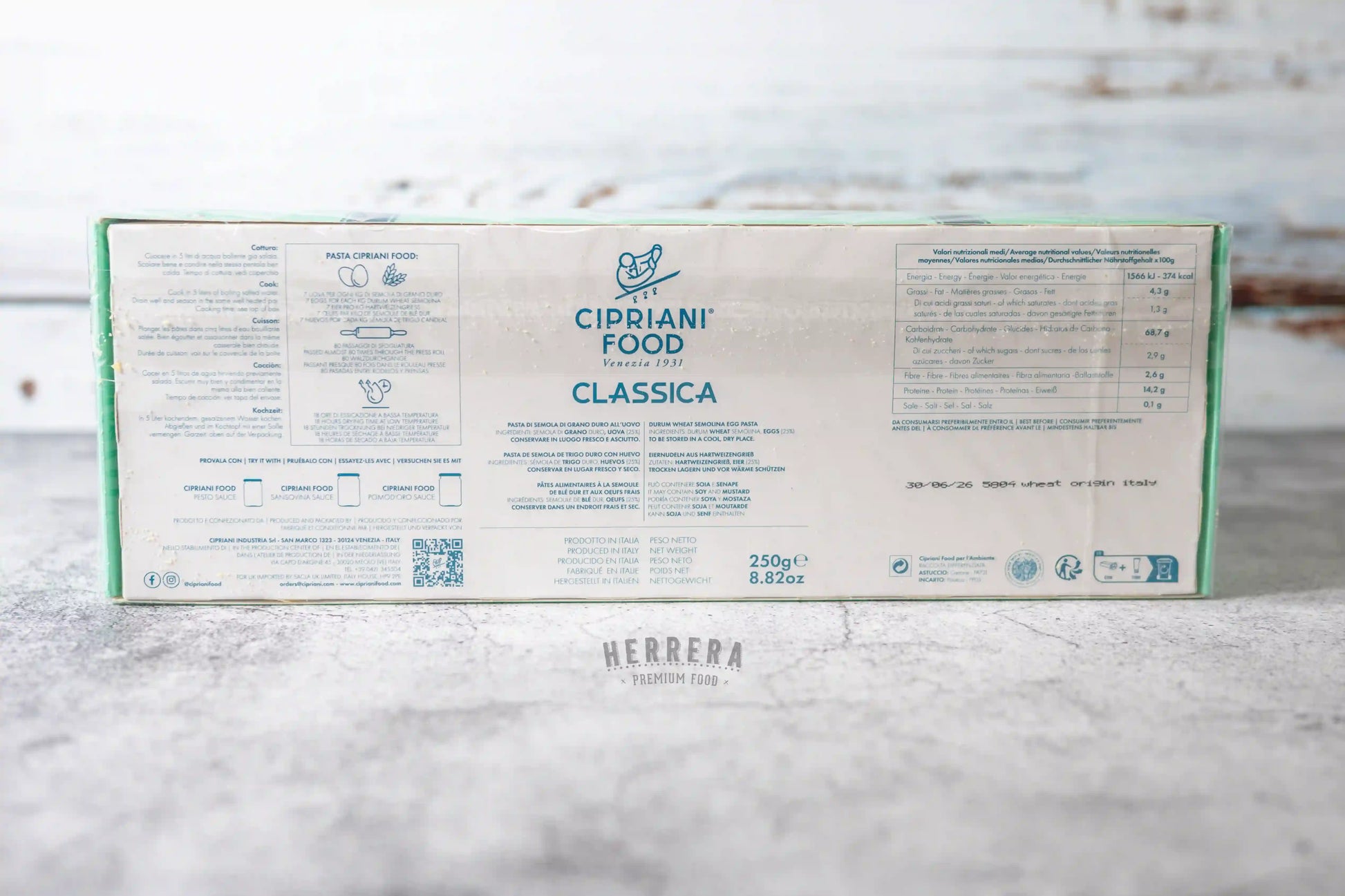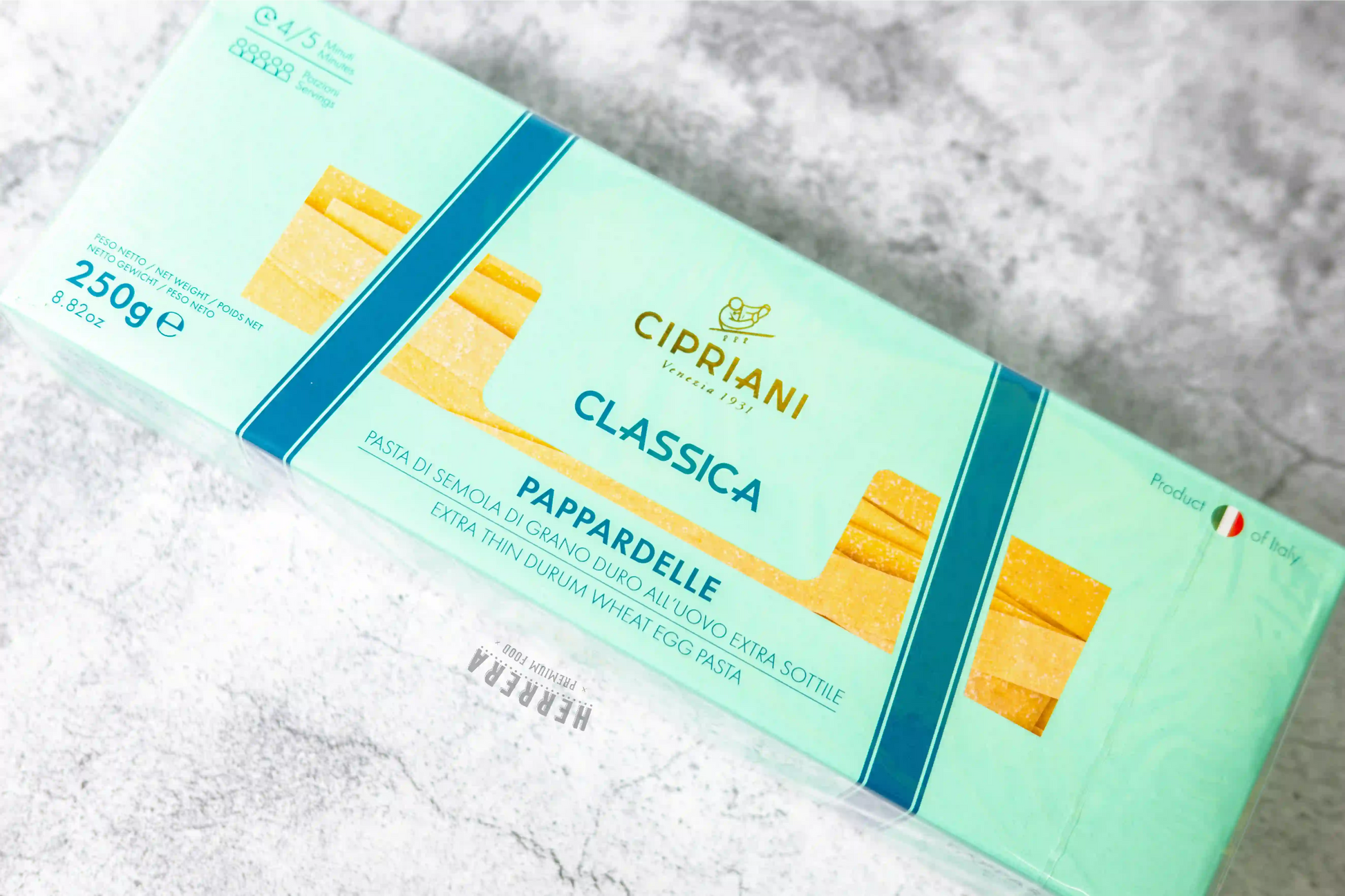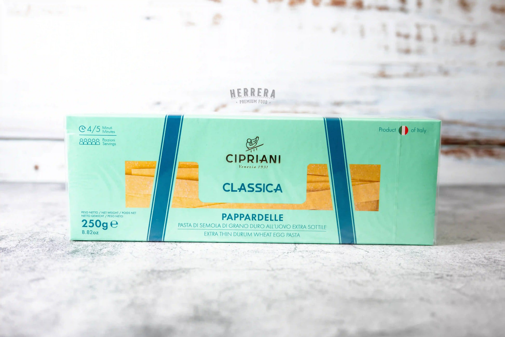 Disfruta de los Pappardelle Cipriani, una pasta al huevo ideal para combinar con una deliciosa salsa de quesos. Con un tiempo de cocción de solo 4 minutos, esta pasta te ofrece la experiencia auténtica de la cocina italiana, elaborada con ingredientes de alta calidad y la tradición que caracteriza a Cipriani. ¡Lleva lo mejor de Italia a tu mesa con Herrera Premium Food!