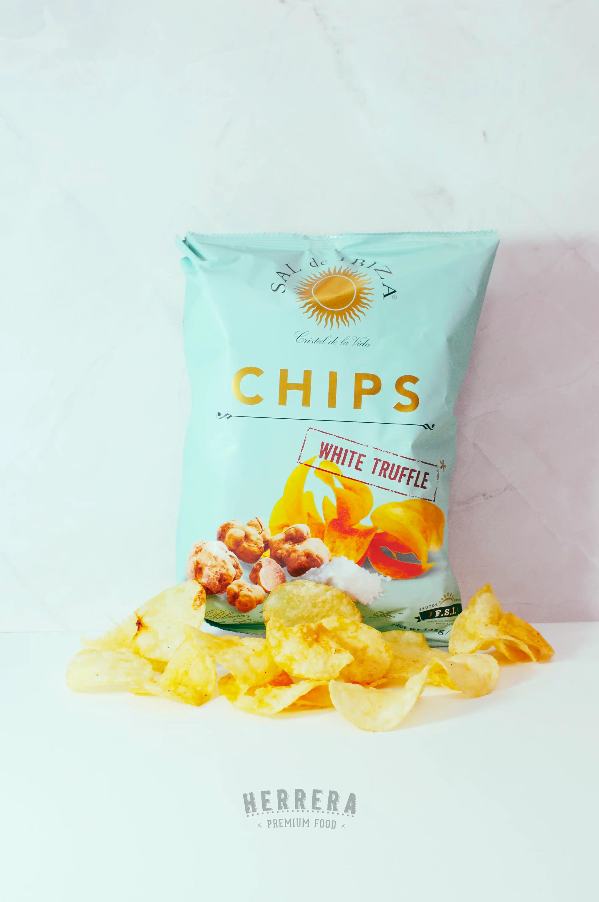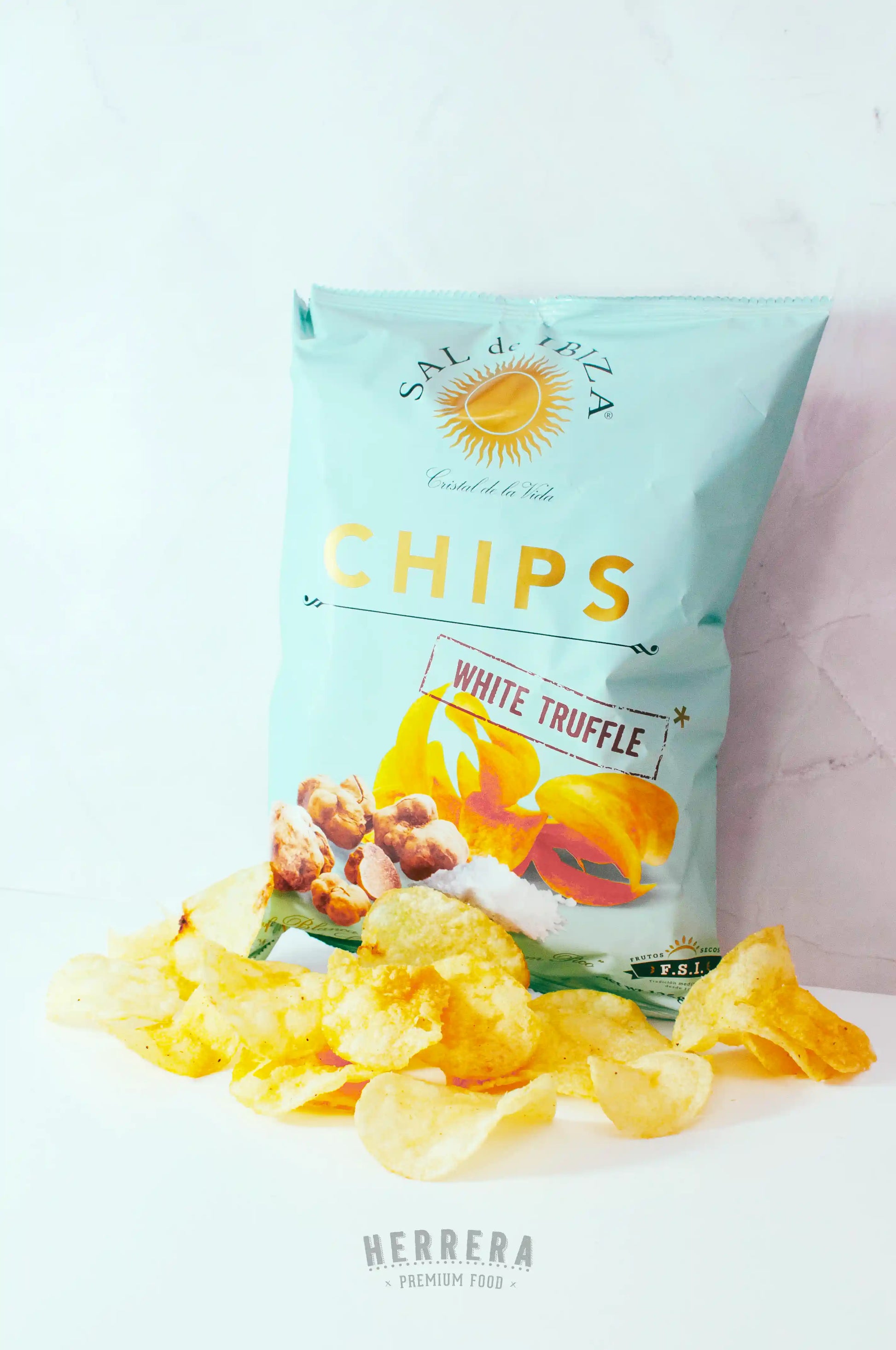- Ingredientes: Patatas seleccionadas, aceite de girasol, sal marina de Ibiza (3%), aroma de trufa blanca (Tuber magnatum), extracto de levadura.
