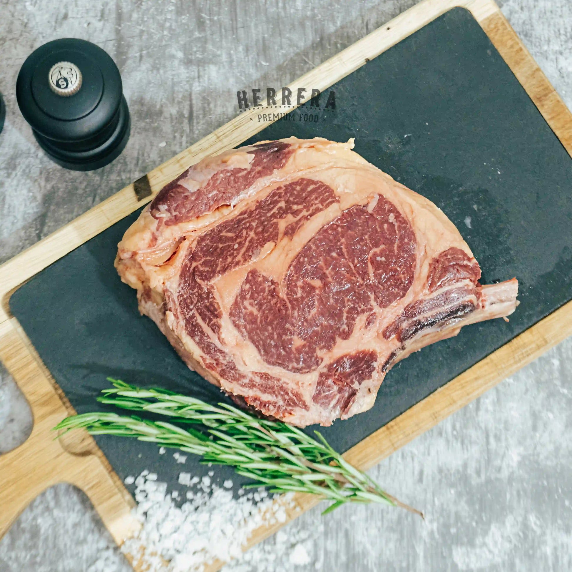 En HerreraFood, te presentamos el Rack Chuletón (Cowboy Steak) Dry Aged Discarlux, una pieza de 800 g a 1 kgprocedente del lomo alto de vaca de selección europea. Este corte, sometido a un proceso de maduración en seco (Dry Aged), ofrece una textura tierna y un sabor intenso, ideal para los amantes de la carne premium.