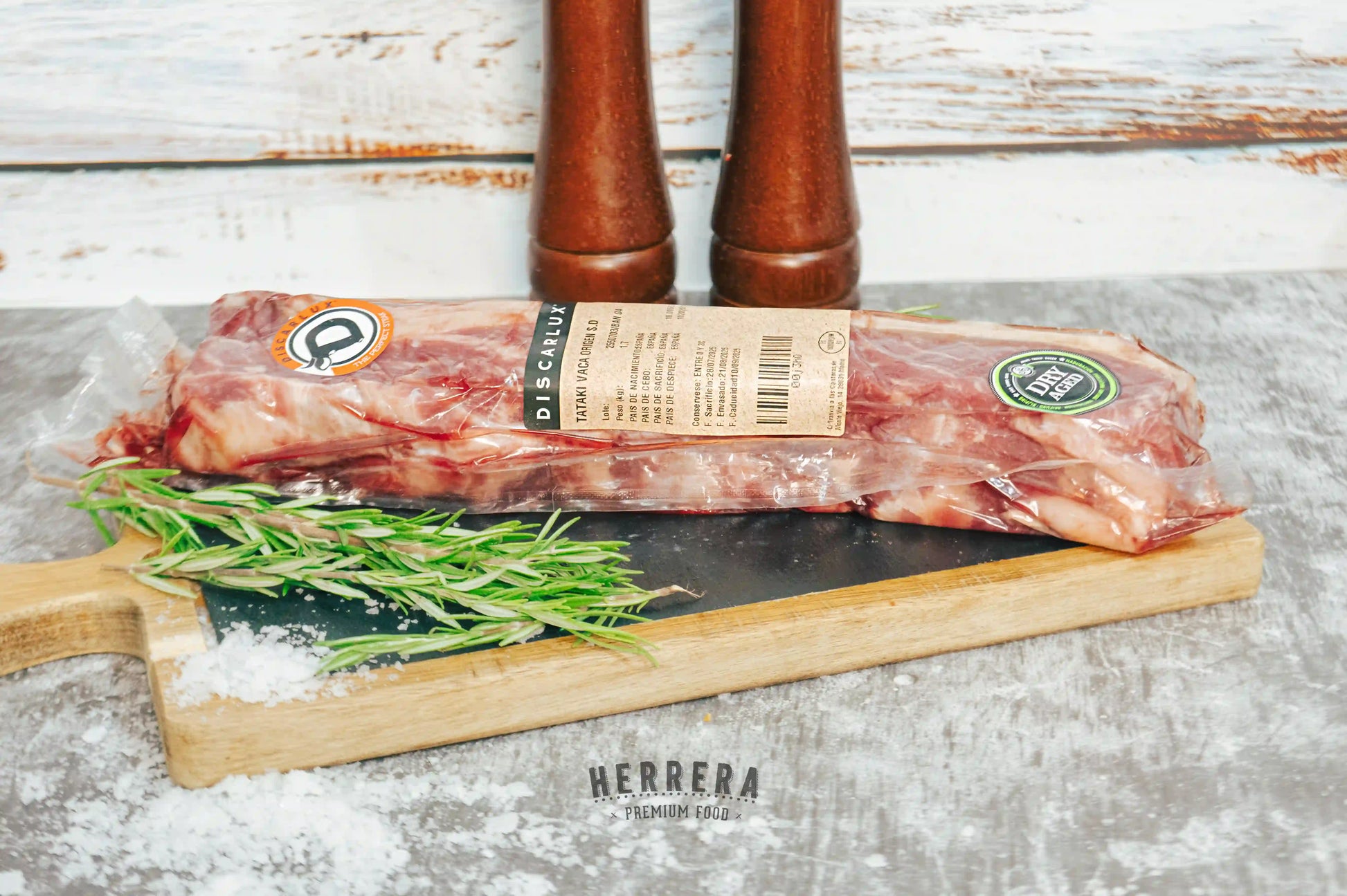En HerreraFood, te presentamos el Tataki de Vaca Discarlux, elaborado a partir de lomo bajo, una de las partes más nobles del vacuno de selección europea. Esta pieza de aprox. 1,7 kg está sometida a Dry Aged para potenciar su sabor y ternura, ofreciendo una experiencia gourmet ideal para los amantes de la carne.